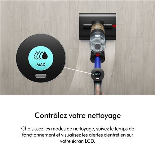 L’écran intégré affiche la durée de fonctionnement, les alertes, les guides interactifs et l’état de maintenance. Un code QR permet une configuration facile de l’aspirateur via l’application MyDyson.