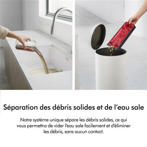 Son système de séparation des solides et des liquides facilite une élimination hygiénique des déchets, tandis que les rouleaux secondaires, tournant en sens inverse, assurent un nettoyage léger, fluide et sans effort, même autour des meubles, des chaises ou des pieds de table.